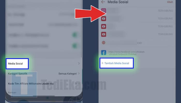 Klik bagian itu untuk lihat medsos mana aja yang udah pernah kamu sambungin ke akun affiliate kamu.